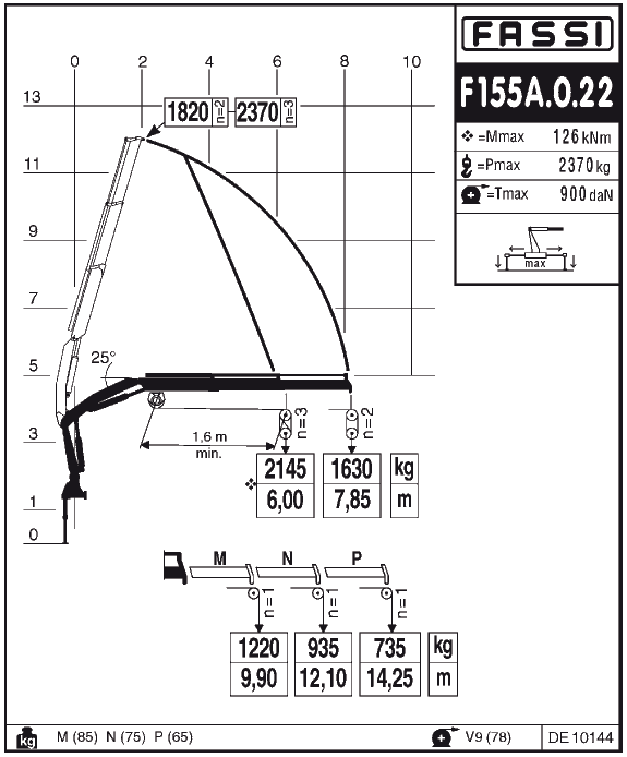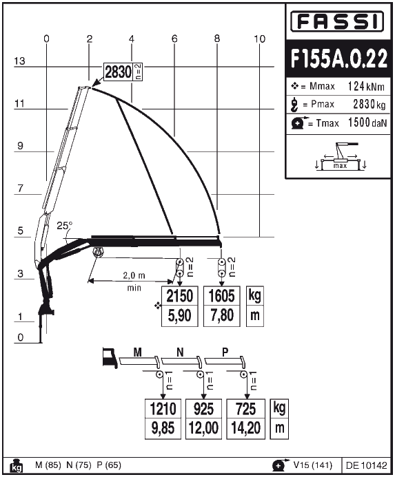 Кран-манипулятор FASSI F155A0.22 оборудован компактной внешней стрелой, которая позволяет осуществлять подъем грузов под крюком на большую высоту и вертикально поднимать объемные грузы. Грузовой момент составляет – 13,5 т.м; грузоподъемность на минимальном вылете стрелы 2,15 м – 6160 кг., на максимальном вылете стрелы 8,00 м – 1660кг. В эксплуатации крана за безопасность отвечает инновационная и одна из самых современных систем гидравлической защиты от перегрузки FX100, которая автоматически контролирует грузоподъемность крана манипулятора и регулирует соотношение подъемного момента с условиями устойчивости грузового автомобиля.