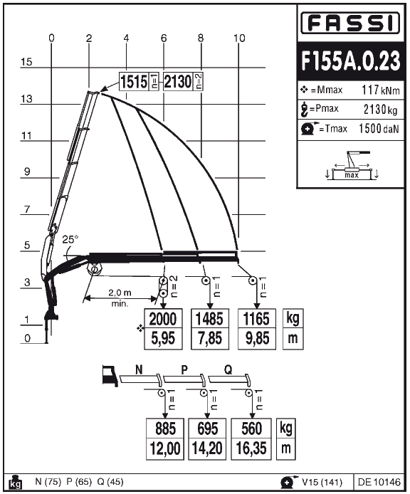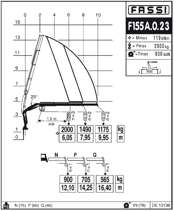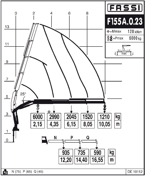 Грузовой момент крана-манипулятора FASSI F155A 0.23 составляет – 13,05 т.м; грузоподъемность на минимальном вылете стрелы 2,15 м – 6000 кг., на максимальном вылете стрелы 10,05 м – 1210 кг.