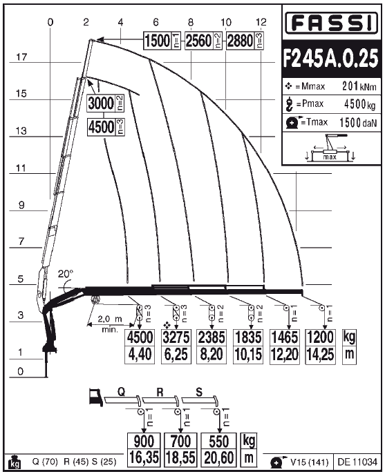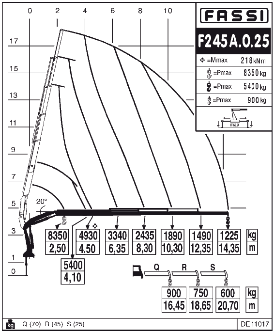 Максимальная грузоподъемность крана-манипулятора FASSI F245А.0.25 – 8350 кг, максимальный гидравлический вылет стрелы – 14,35 м. При установке дополнительно 3-х механических секций вылет стрелы увеличивается до 20,70м при этом грузоподъемность составит 600кг.