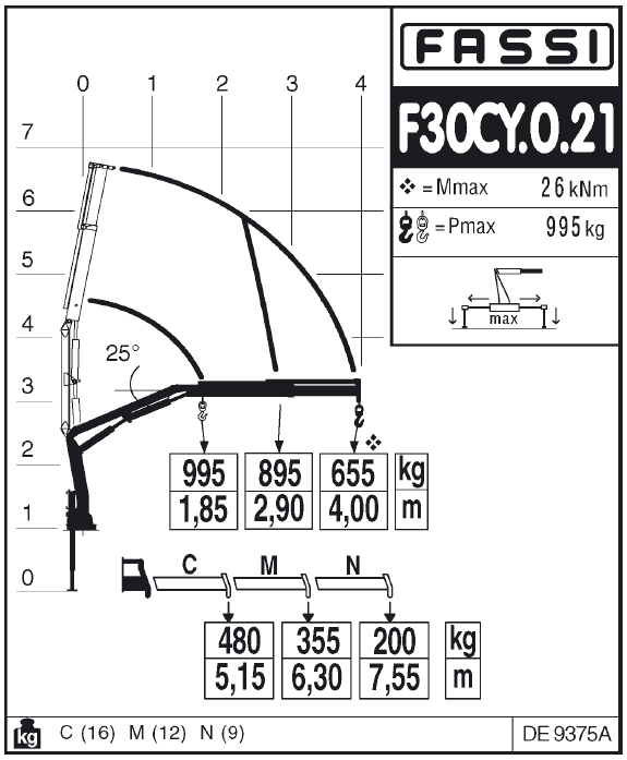 Грузоподъемность на минимальном вылете стрелы 1,85 м – 995 кг, на максимальном вылете стрелы 4,00 м – 665 кг.