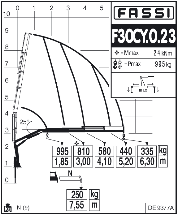 Грузоподъемность на минимальном вылете стрелы 1,85 м – 995 кг, на максимальном вылете стрелы 6,30 м – 335 кг