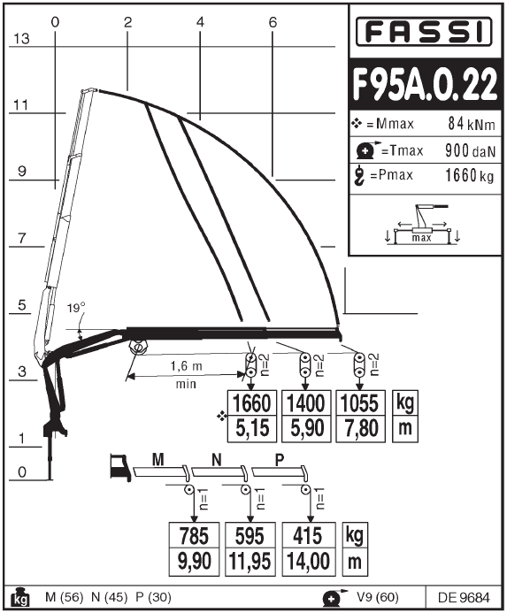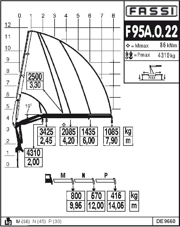 Грузоподъемность на минимальном вылете стрелы 2,00 м – 4310 кг, на максимальном вылете стрелы 7,90 м – 1085 кг.