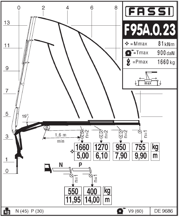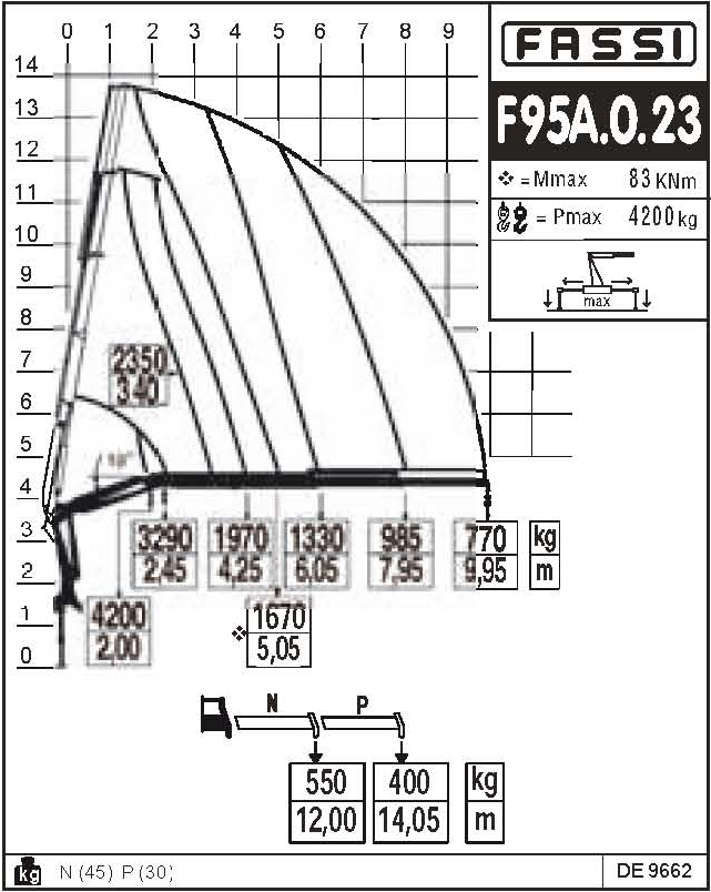Грузоподъемность КМУ на минимальном вылете стрелы 2,00 м – 4200 кг, на максимальном вылете стрелы 9,95 м – 770 кг.